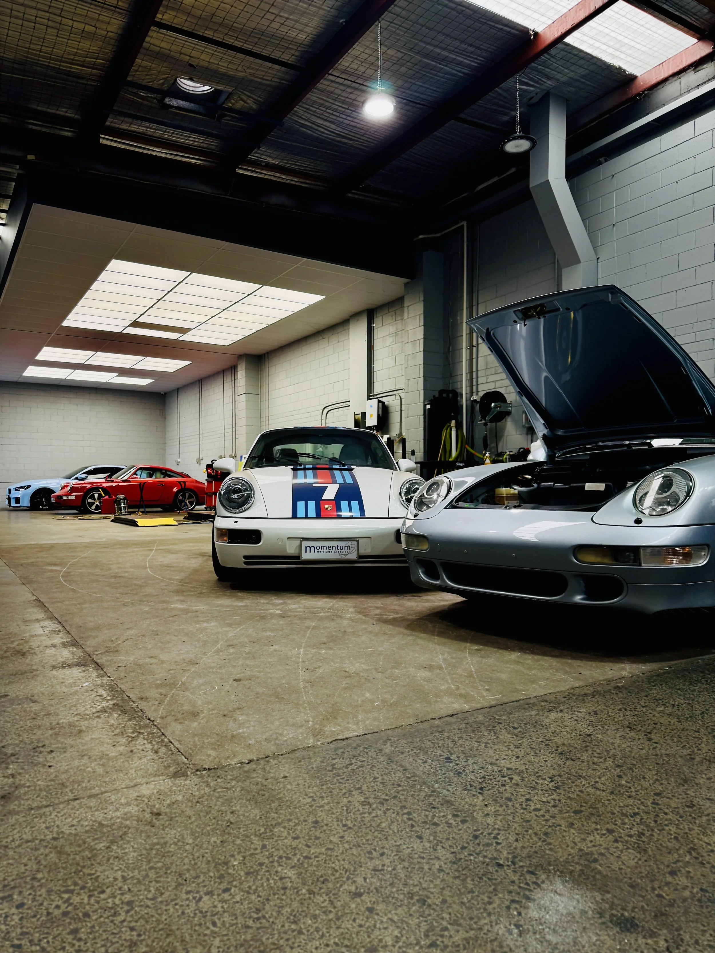 Inside a garage with three luxury cars, including a black Porsche, a silver Nissan GT-R, and a silver Mercedes-Benz.